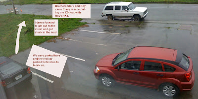 Early the next morning... 7 AM (if you know me you know this is early for me) I went out thinking "I'll show em... I'll just put my rig in 4X4 and pull out to the street. Well the joke was on me. Without really looking at the ground before me I proceeded to pull out onto a bog! All 4 tires (4X4) sank into the mud.