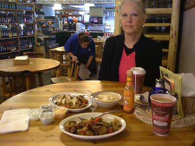 hand-made sausages. Their breakfast is served before 10:30 in the morning . Val and I got 1 order of their potatoes with a variety of sausages and peppers etc. and two 16 oz. coffees and slpit the meal. The cost? $5! An incredible deal!